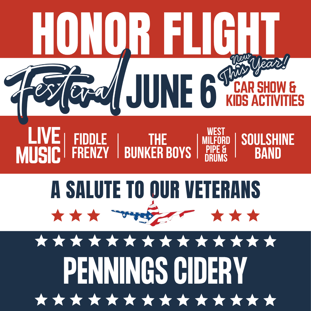Join us at the orchard for our Honor Flight Festival, where we raise a glass to the real heroes—our veterans—and support the incredible mission of Hudson Valley Honor Flight, a nonprofit flying vets to D.C. to visit their memorials.